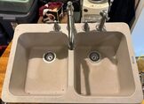 Elleci Granitek Tan (Avena) colored granite sink with nickel faucets.
