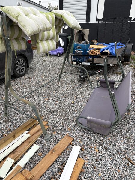 Giving free a deck swing, comes with frame and swing and three pillows.