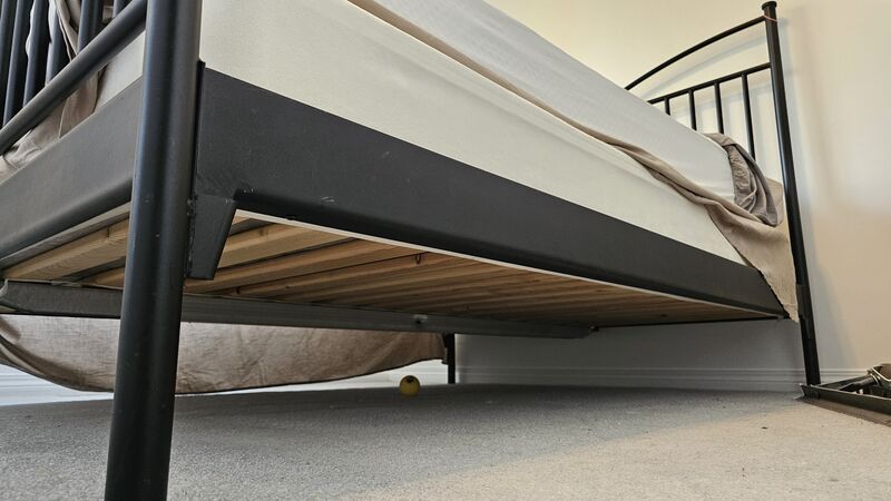 Queen size memory foam mattress and box spring in an IKEA bedframe