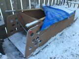 Sturdy, home-made wood sled @ 7' L X 28" W X 25" H for hauling gear and/or 2 smaller people. Tarp covering needs replacing with 8' X 10"' tarp & new rope.