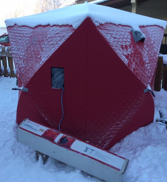 3-pers Outbound ice fishing tent (uninsulated, still in orig. box, purchased during Cdn Tire end-of-season sale for $200) and several short ice fishing rods are available (see photo of similar attached insulated Outbound tent).