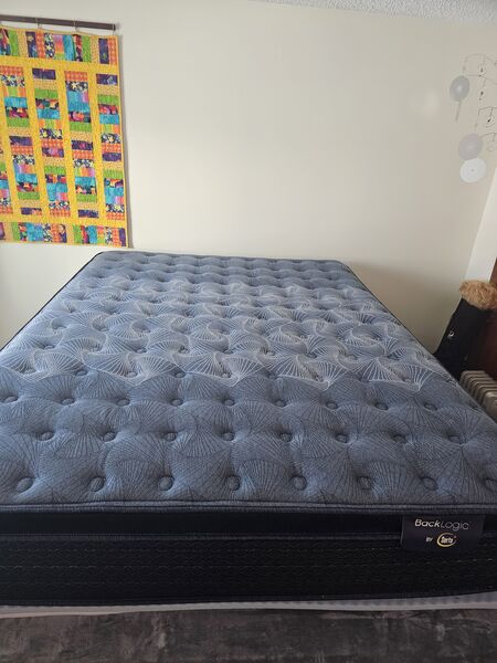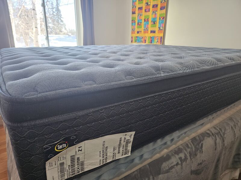 Black logic Serta brand. Bought last August for family visits during the Christmas Season. In excellent condition with the factory and shipping tags still attached. Always has had a mattress protector on it.