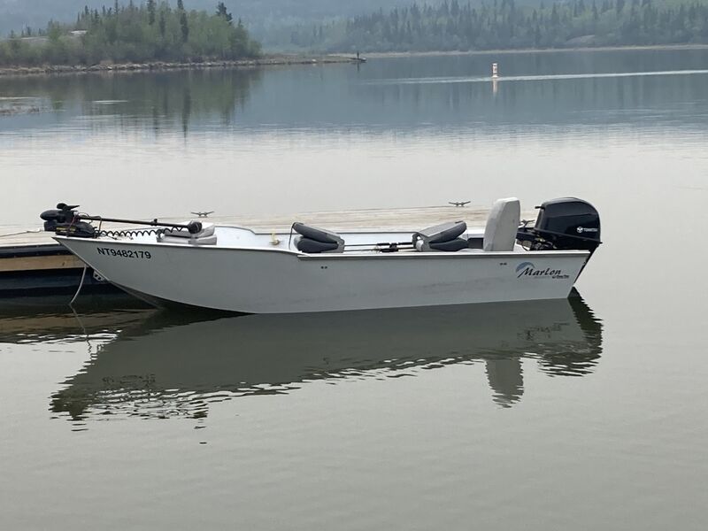 Very solid, fully welded aluminum boat with raised forward gunwales. Very stable, feels bigger than it is. Built by River Hawk Boats, not available from Marlon anymore.
