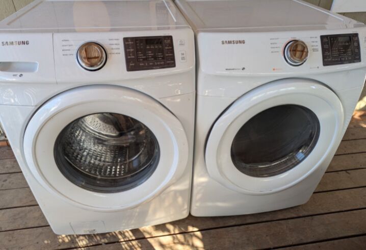 Samsung front load washer and dryer set. These machines are both in excellent working order. Everything and all cycles work great on the washing machine with no issues no leaks smooth operation no problems. Dryer heats and spins perfectly with good heat. 27" wide can also be stacked with kit. $550 for the pair can also drop off for extra thank you