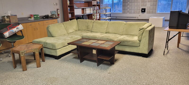Used green suede sectional couch for sale. Good condition from a pet-friendly, non-smoking home. Has been in storage, so could likely use a vaccum.