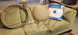 Used chandelier. Antiqued bronze/gold colour. Alabaster coloured glass. Complete with components needed for installation.