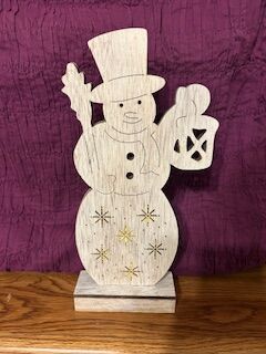 Wooden Standing Cut Snowman. Approx. 12" tall. Ready for your own painting and decorating. for Xmas. Lights up with 2 AA batteries.