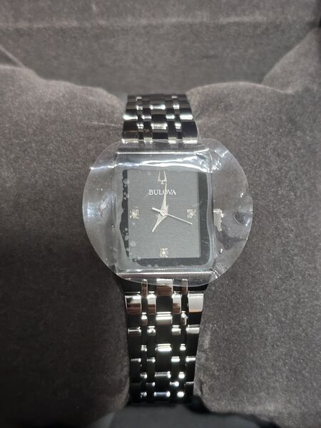 Tried it on and put the watch in the box. Stainless steel with edge-to-edge black face, never worn. Ready for resize to fit the new owner. Watch comes with box, cover and setting instructions and warranty information.