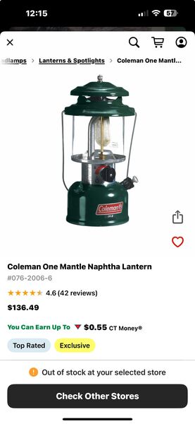 Coleman one mantle naptha amping fuel lantern, new in the box.