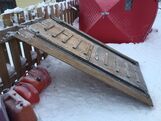 Home-made ramp for loading a single snowmobile onto a standard truck bed. Folds into @ 37" L X 34" W X 5" D pkg + 2 X 8"W X 6' L X 2" D side ramps, assembles quickly with hammer and locking clips. Heavier but cheaper than than a set of three 6' steel ramps. Built to handle SM skis 36 - 51" wide.