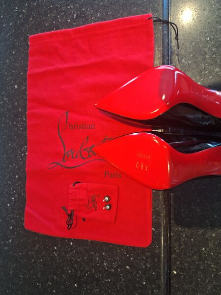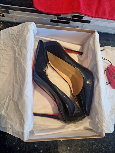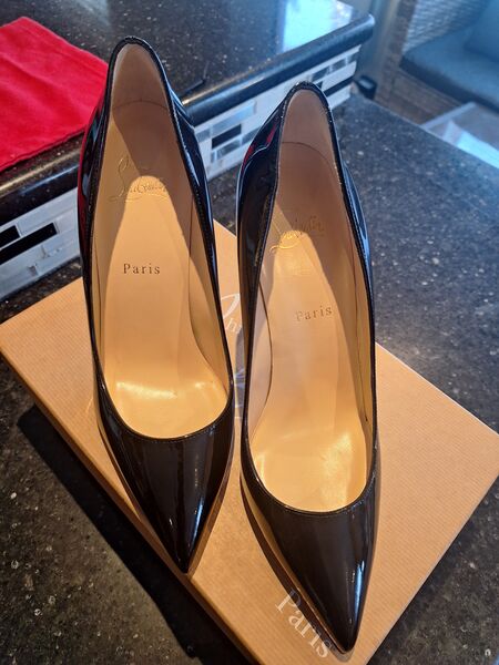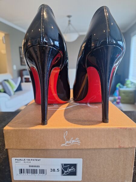 Elegant PIGALLE 100 PATENT black heels with signature red soles. Perfect for a sophisticated look (Size 8.5 with 4" heel height).