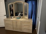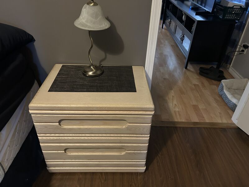 White washed oak furniture with king size mattress and box spring. Lamps included as per picture.