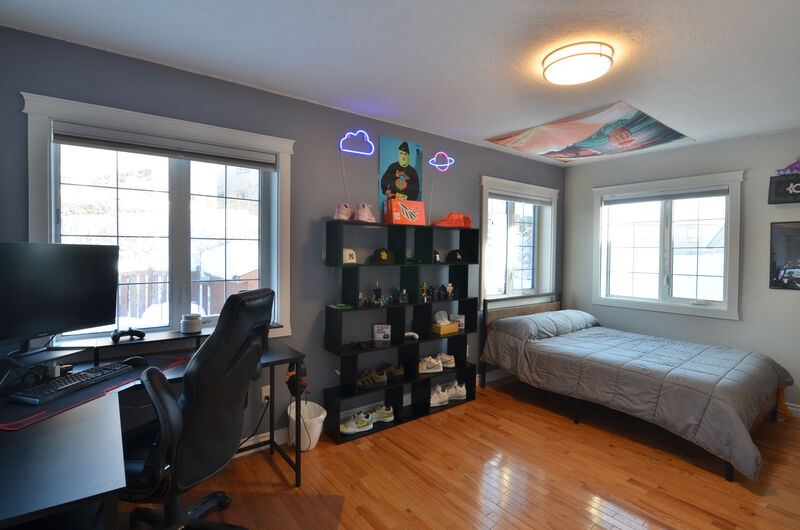 Upon entry, a spacious tiled foyer welcomes occupants and guests, seamlessly transitioning to rich ¾-inch solid hardwood flooring. The main level includes a generous family room centered around a pellet stove, two well-proportioned bedrooms, and a full bathroom. This configuration is ideally suited for guests, teens, or versatile living arrangements.