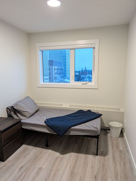 The room is furnished with a twin bed and a 2-drawer nightstand. You would have your own bathroom.