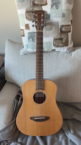 Veelah 3/4 size guitar, ideal for a kid's first instrument or as a travel guitar. Has some damage due to the humidity, but still plays and sounds just fine.